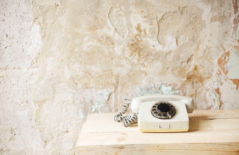 Старый белый ретро-телефон с циферблатом черного цвета на необработанной деревянной доске