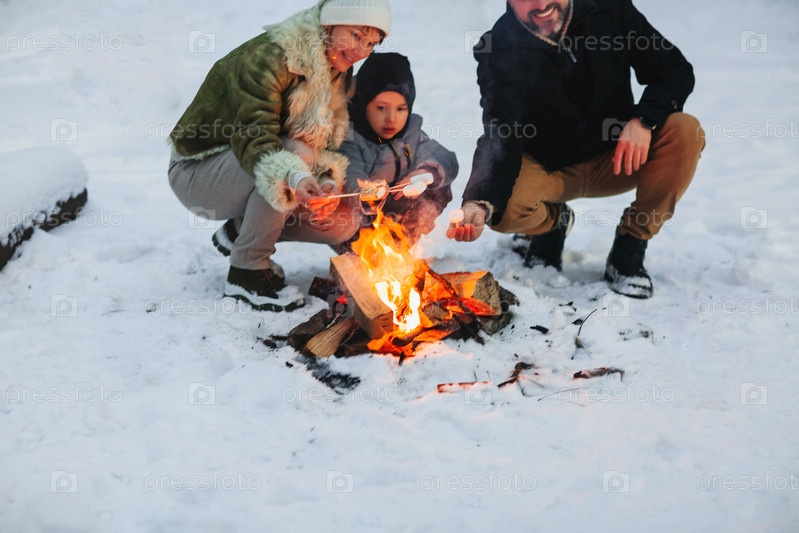Счастливая семья отдыхает у костра зимой