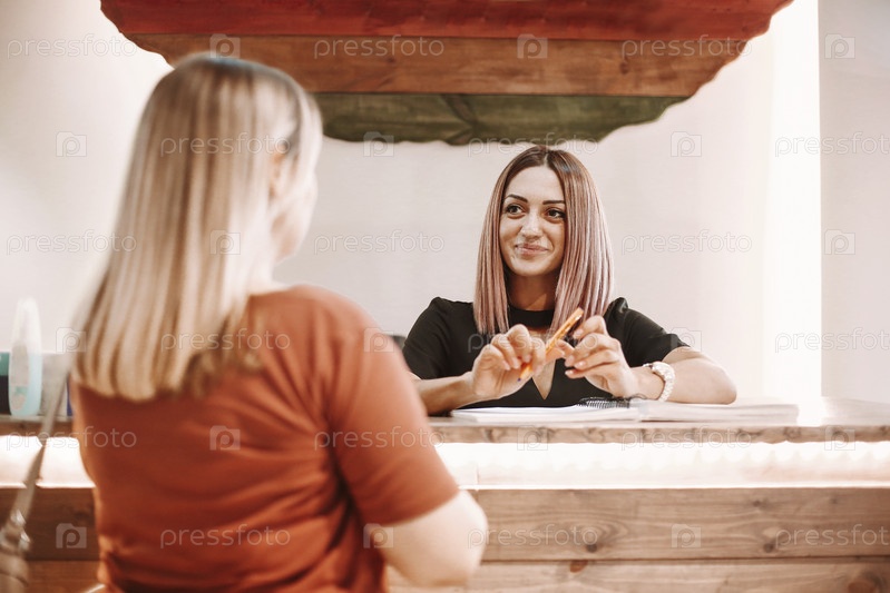 Женщина пишет встречу с клиентом в салоне