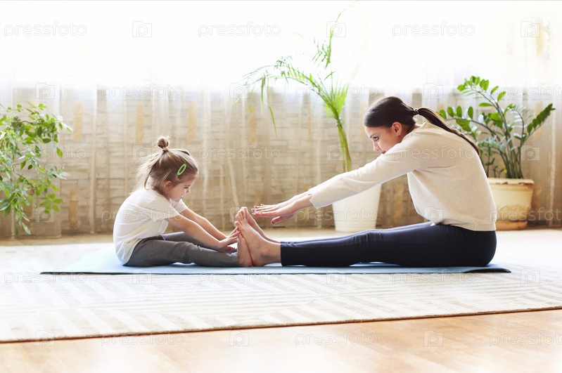 Женщина и маленькая девочка растягивают ноги дома