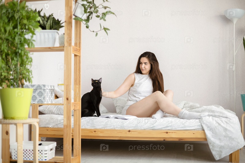 Молодая женщина смотрит на кошку утром