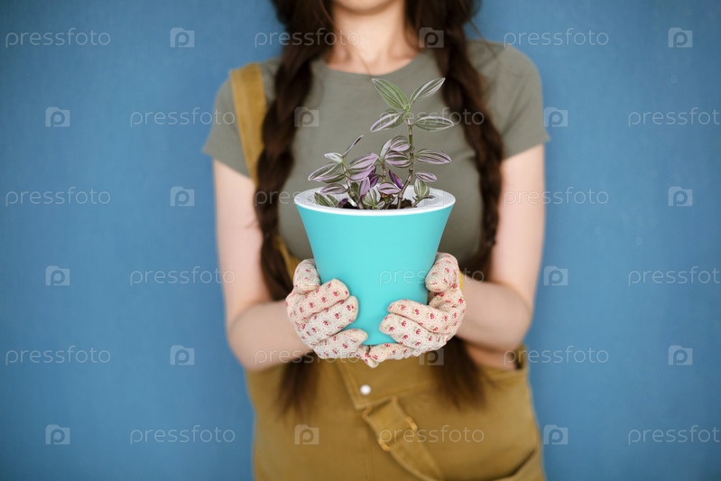 Женщина-садовник показывает растение в горшке