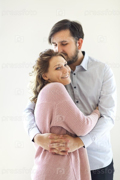 Нежная пара обнимается на белом фоне