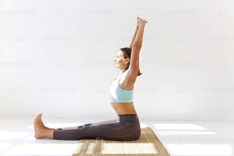 Гибкая женщина занимается йогой дома