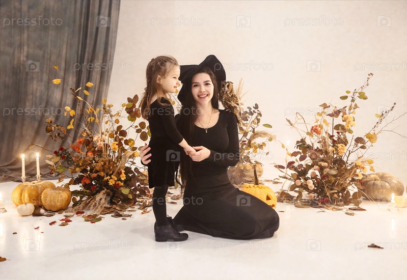 Очаровательная женщина и девушка в костюмах на Хэллоуин