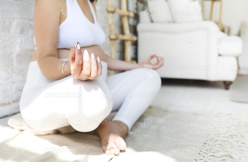 Красивая беременная женщина растягивается и занимается йогой дома