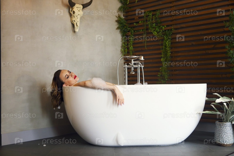 Счастливая молодая женщина расслабляется в ванне