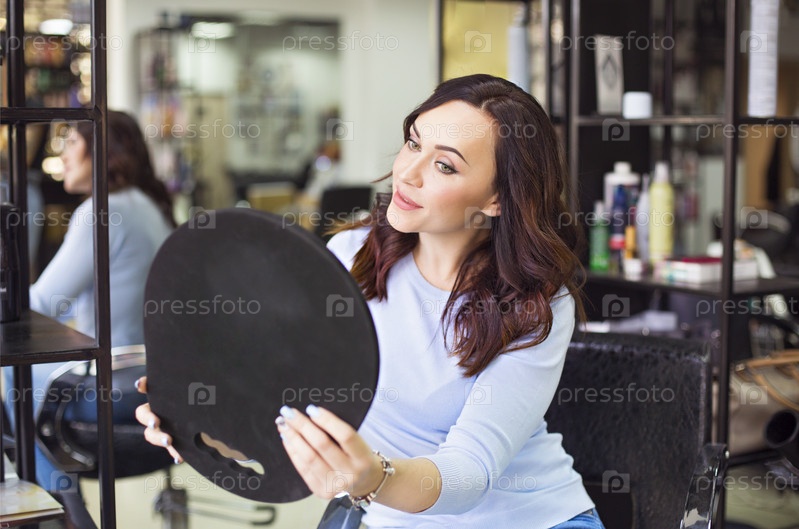 Молодая красивая длинноволосая женщина улыбается зеркалу
