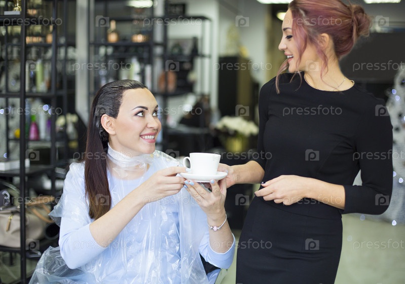 Профессиональный парикмахер дает чашку кофе своей красивой жизнерадостной клиентке