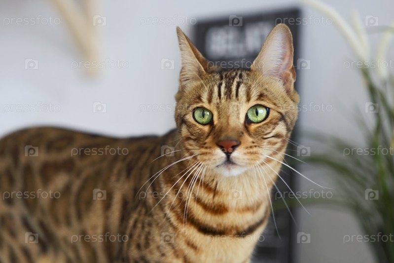 Красивый бенгальский кот на белом кухонном столе с растением