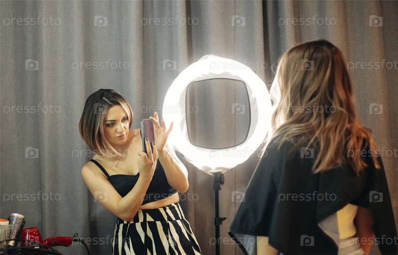 Молодой парикмахер делает профессиональное фото волос клиентов перед яркой лампой