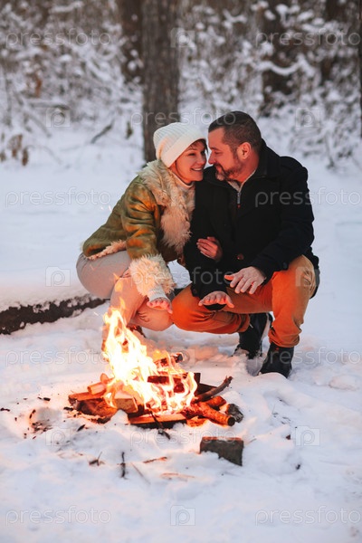 Счастливая влюбленная семейная пара греется у костра на улице в зимнем снежном лесу
