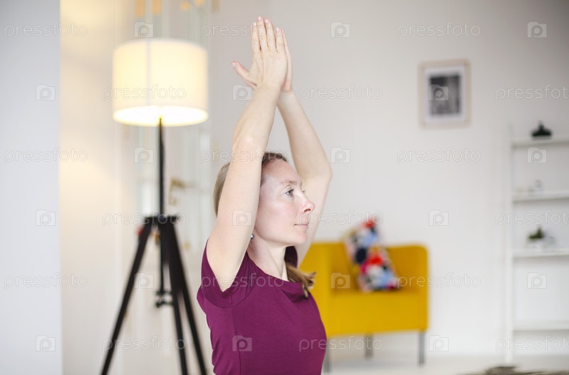 Молодая спокойная блондинка практикует йогу в гостиной дома