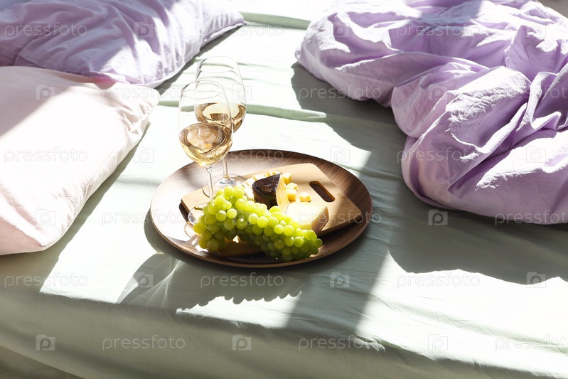 Вино и еда на кровати в солнечный день