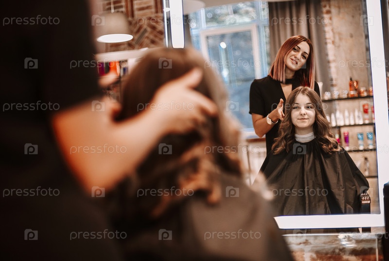 Молодая красивая длинноволосая женщина улыбается зеркалу своему парикмахеру