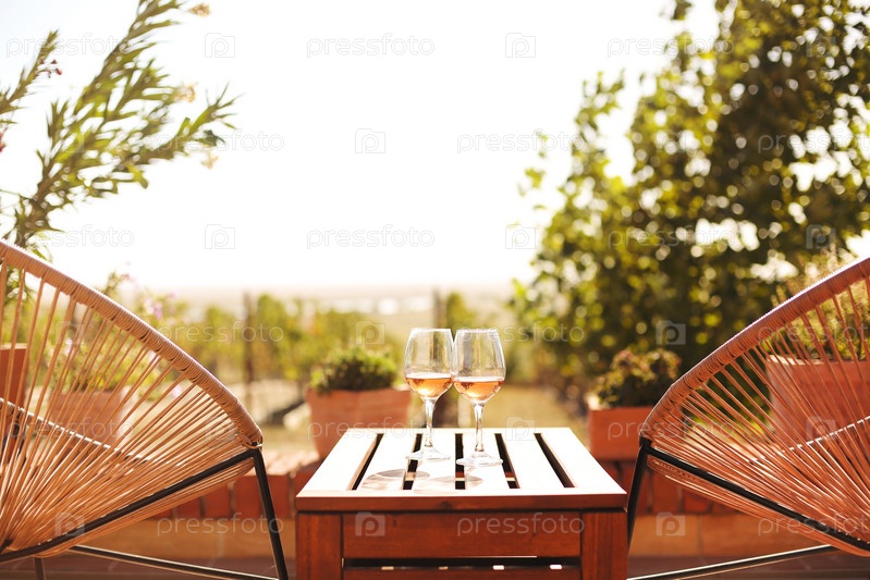 Бокалы белого вина на деревенском деревянном столе и цветочные горшки на террасе снаружи