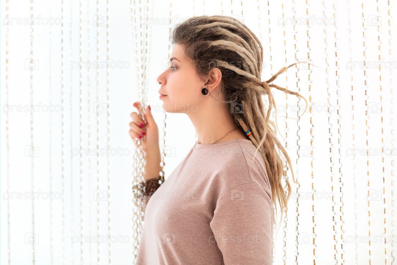Брюнетка с пирсингом в носу смотрит в сторону, раздвигая внутренние шторы