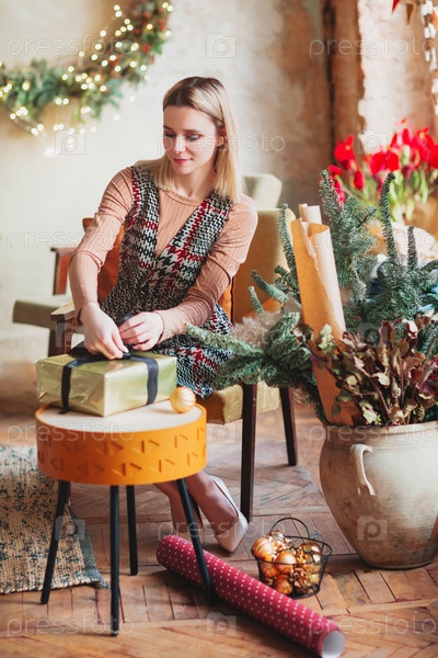 Счастливая блондинка, сидящая на стуле в новом году, празднично упаковывает рождественскую подарочную коробку