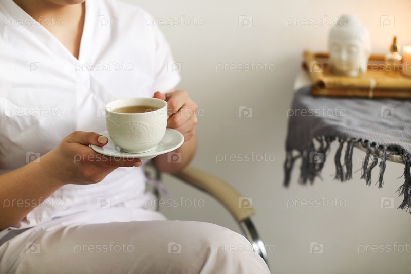 Счастливая милая молодая женщина-медицинский работник искренне смеется, держа чашку горячего чая