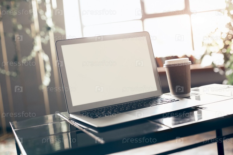 Пустой экран ноутбука с корпусом клавиатуры, лежащим на маленьком черном столе
