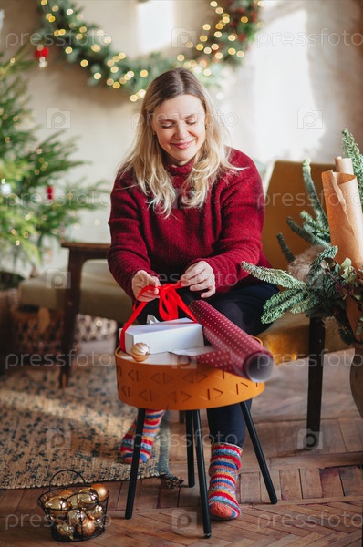 Улыбающаяся женщина сидит на стуле в новогодней празднично украшенной гостиной и упаковывает рождественскую подарочную коробку