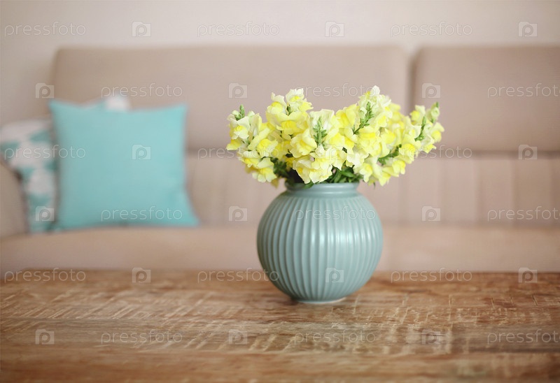 Деревянный журнальный столик с букетом желтых цветов в вазе на переднем плане в интерьере гостиной