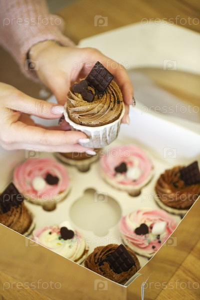 Женщина-пекарь упаковывает свежие украшенные маффины со сливками в коробку для рукоделия