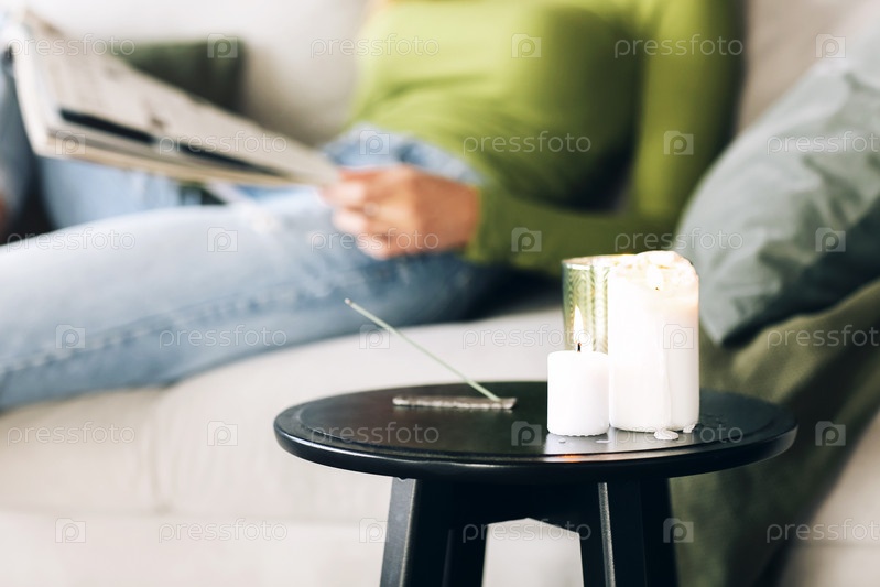 Горящая ароматическая палочка и свечи на журнальном столике на размытом фоне гостиной