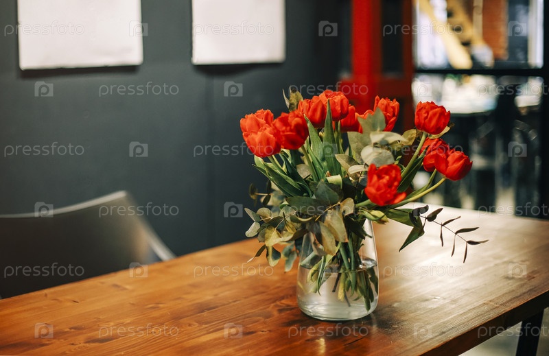 Букет свежих красных тюльпанов в стеклянной вазе на деревянном столе в гостиной