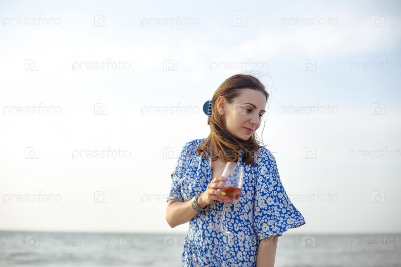 Счастливая взрослая женщина с вином отдыхает на пляже