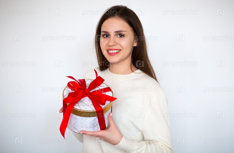 Женщина в белом свитере держит круглую подарочную коробку, перевязанную ярко-красной лентой во время празднования праздника