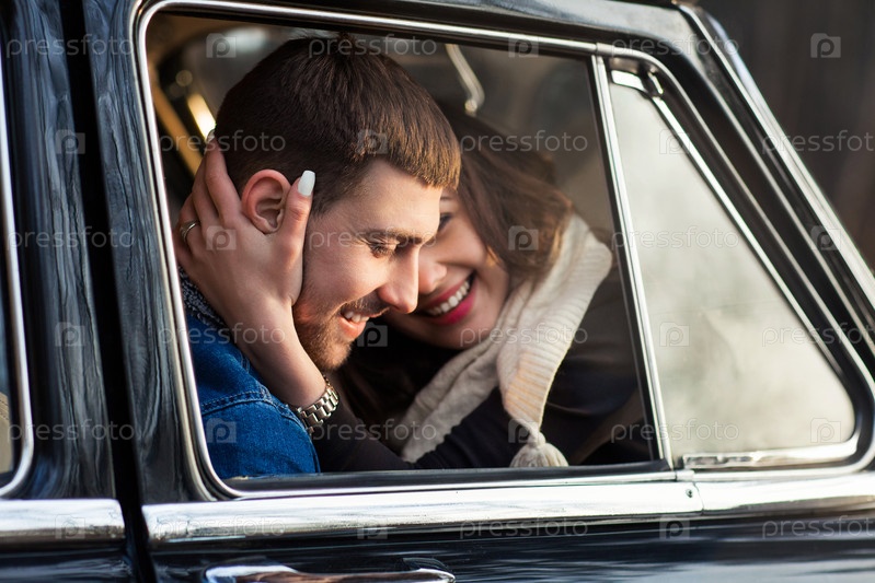 Счастливая пара в старинной машине