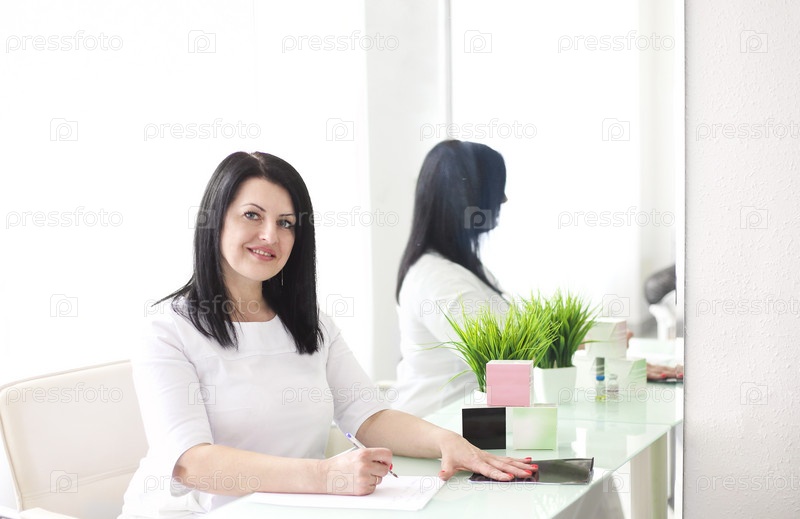 Красивая молодая улыбающаяся женщина-врач сидит за столом