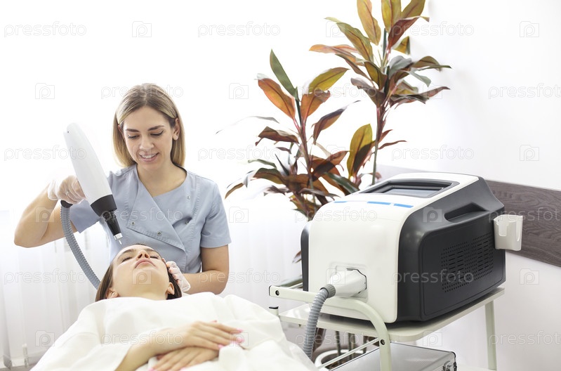 Женщина лечит лицо клиента лазером