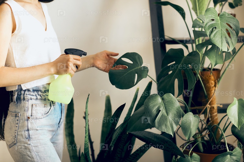 Молодая женщина ухаживает за растениями дома