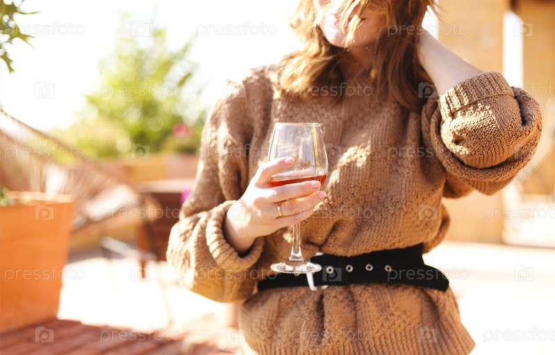 Неузнаваемая женщина пьет вино во дворе