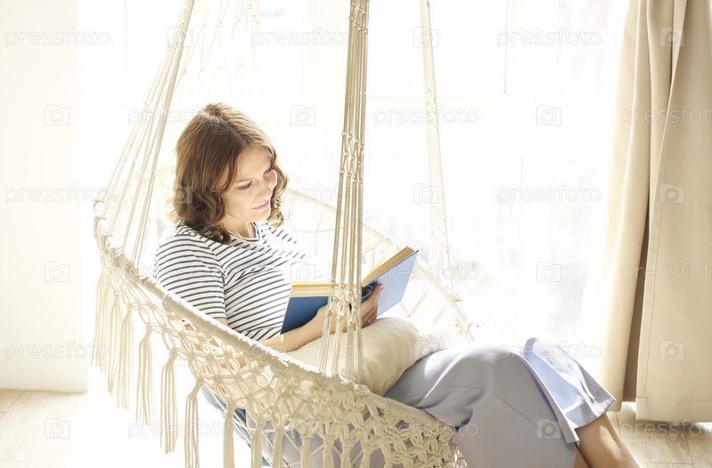 Счастливая женщина читает книгу в подвесном кресле