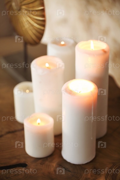 Зажженные свечи и украшения на деревянном столе