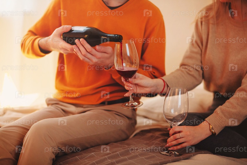 Молодая пара пьет вино дома