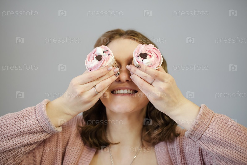 Счастливая женщина играет с кексами