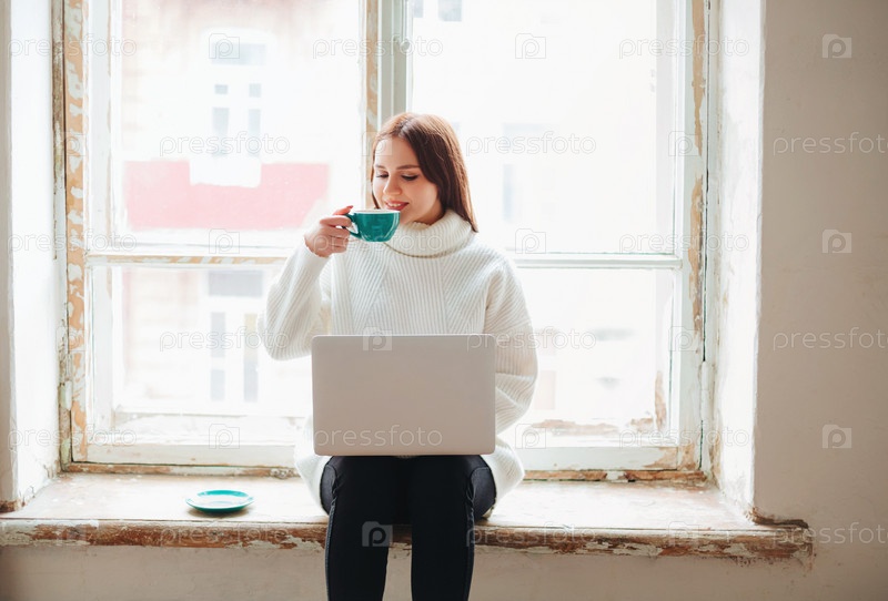 Молодая женщина пьет кофе и пользуется ноутбуком у окна