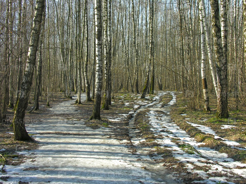 Грунтовая дорога в березовом лесу. Солнечный день в марте. Теплостановский лесопарк, Москва