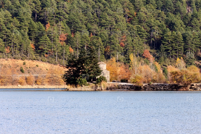 Вид на горное озеро осенью