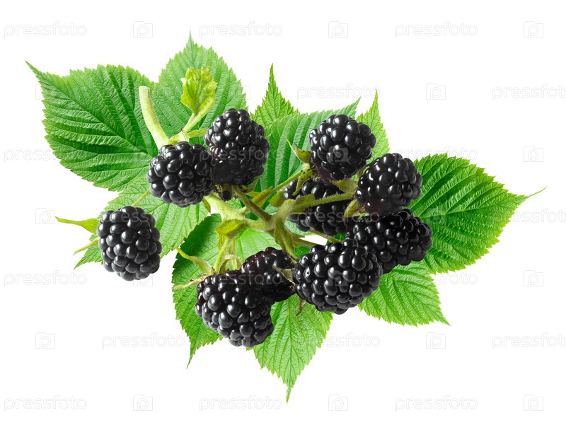Спелая ежевика с листвой, изолированная на белом