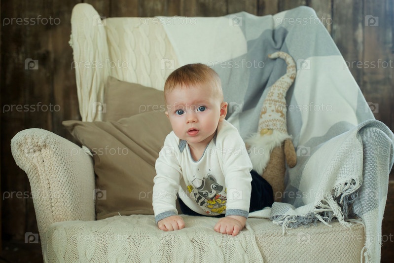 Младенец лежит в кресле, одетый в одежду. Концепция детства