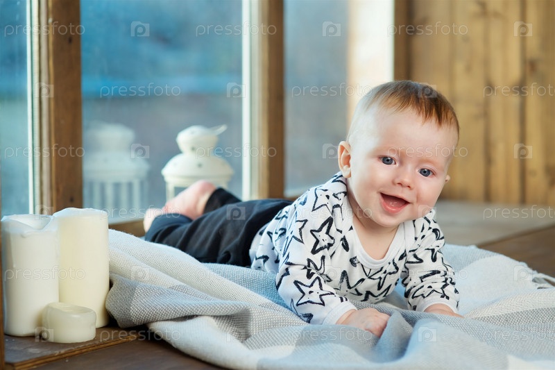 Малышка лежит на мягком одеяле, одетая в модную одежду. Концепция детства