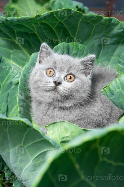Британский серый короткошерстный котенок сидит в капусте крупным планом. Концепция праздника урожая и забавное фото