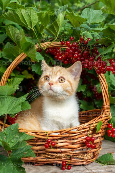 Британский рыжеволосый короткошерстный котенок сидит в корзине из лозы на фоне куста смородины с красными ягодами