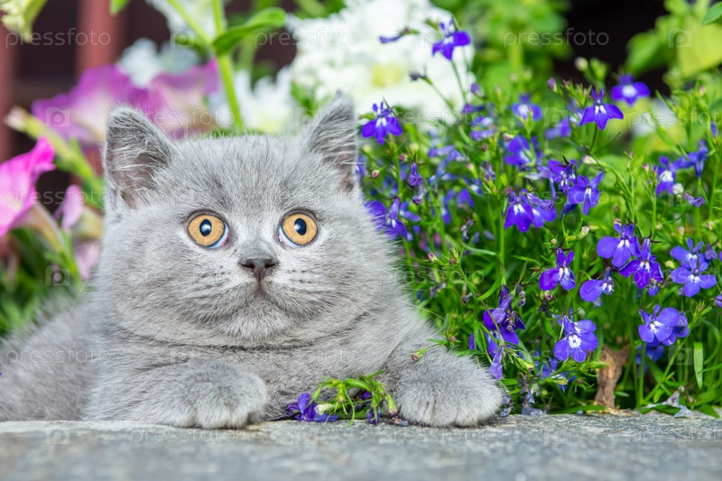 Британский серый короткошерстный котенок сидит на камне в траве крупным планом, на фоне розовой петунии