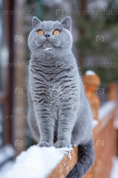 Домашняя кошка британской короткошерстной породы с желтыми глазами в снегу, серая британская кошка сидит на перилах загородного дома на улице морозной зимой